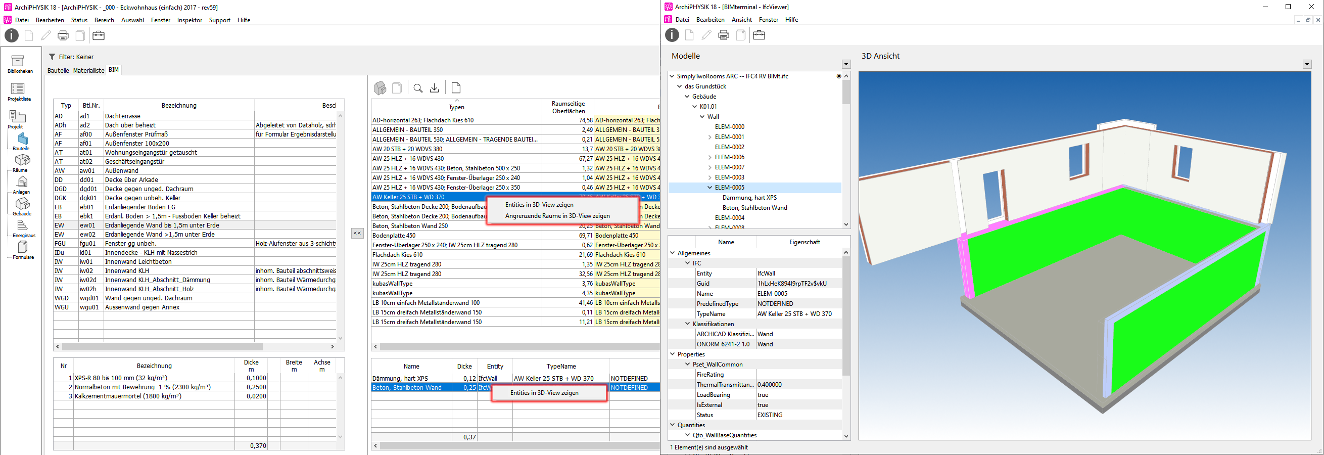 Die Entities (aka Klassen) werden in der 3D-Ansicht eingeblendet und selektiert. In der linken Tabelle des 3D-Viewers werden die Eigenschaften und die IFC-Daten dieser Entities angezeigt.