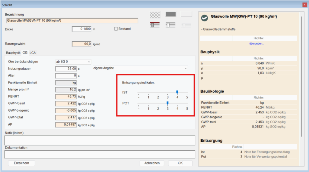 Diese beiden Kennwerte – Entsorgungseinstufung und Verwertungspotential – bilden zusammen mit dem Volumen und der Nutzungsdauer die Grundlage für die Berechnung des Entsorgungsindikators und ermöglichen eine objektive Bewertung der Entsorgungseigenschaften von Baukonstruktionen über den gesamten Lebenszyklus.